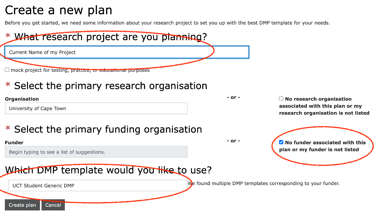 In order to assist students with completing a DMP, DLS manages the UCT DMP platform. This UCT-hosted platform allows users to create data management plans based on our custom-created templates, containing guidance, examples and suggested answers.